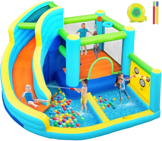 Ktaxon Inflatable Bounce House, Jumping Outdoor Air Castle Children Bouncer Double Water Slide with Air-Blower for Backyard, Park, Lawn (181″ L x 181″ W x 86.7″ H)