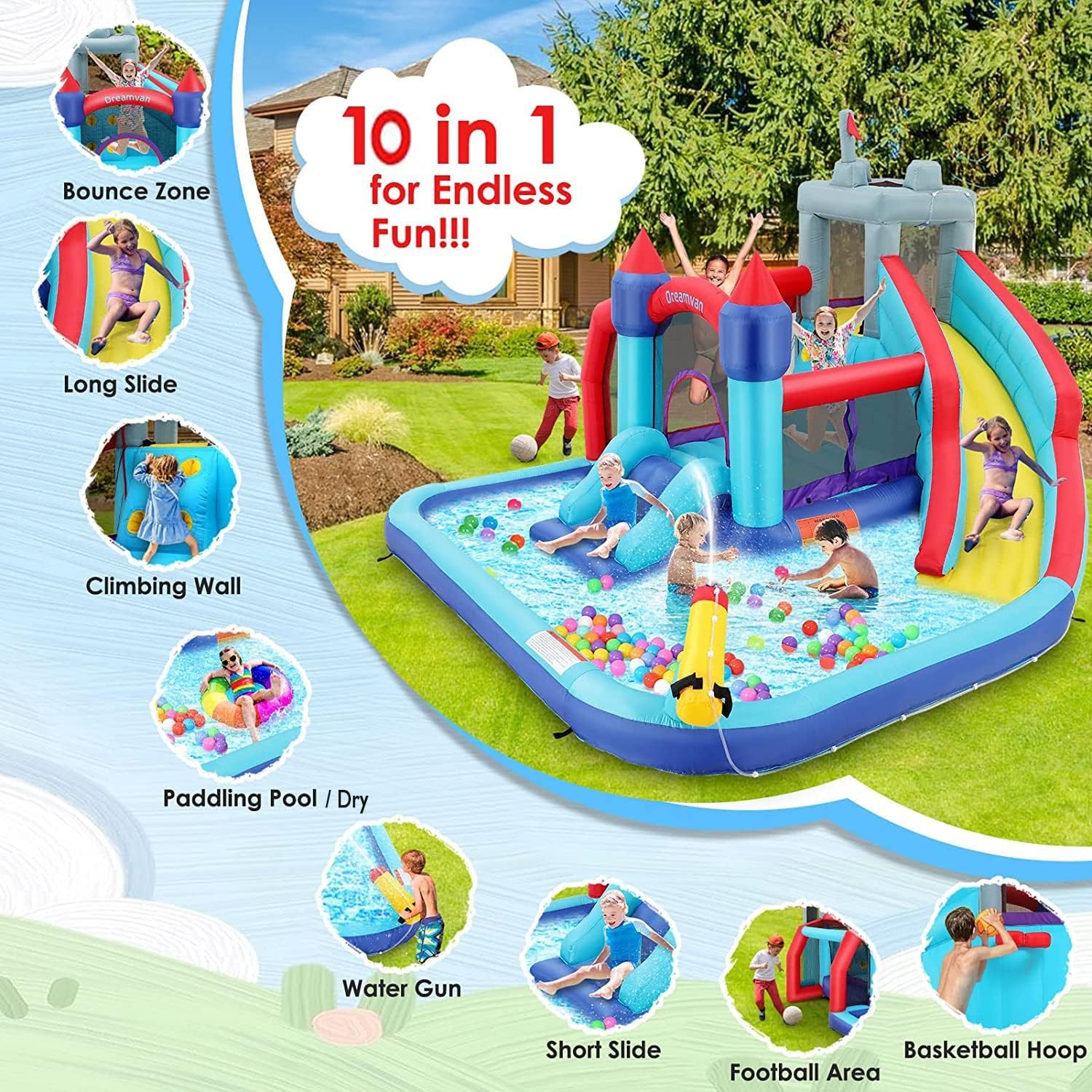 🌈[Complete Fun Combo: Slide, Bounce, Climb & Splash ] – This all-in-one inflatable water park features long & short double slides, a large bouncing area, climbing wall, wide splash pool, basketball rim, soccer goal, and continuous water cannon/shower. Just connect to a garden hose for constant slippery sliding and refreshing splashing—endless entertainment for kids.