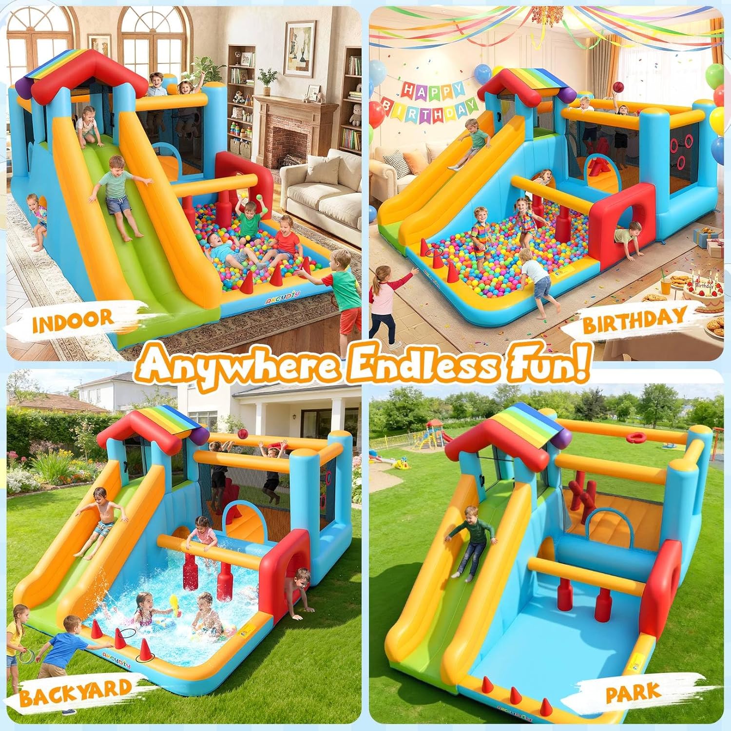 đăSAFETY-BUILT & FULLY CERTIFIEDăEvery AKEYDIY bouncy castle is certified to exceed global safety standardsâASTM, 16CFR1500.3/1505, and ULâand comes with a 25-foot GFCI safety cord as recommended by the CPSC. Built with puncture-resistant material, double-to-quadruple stitching, and fully enclosed bouncing areas, it includes a long slide with guardrails, secure ground stakes, and a non-slip base. With no zippers or metal parts inside, itâs designed to let kids play freely while you relax.