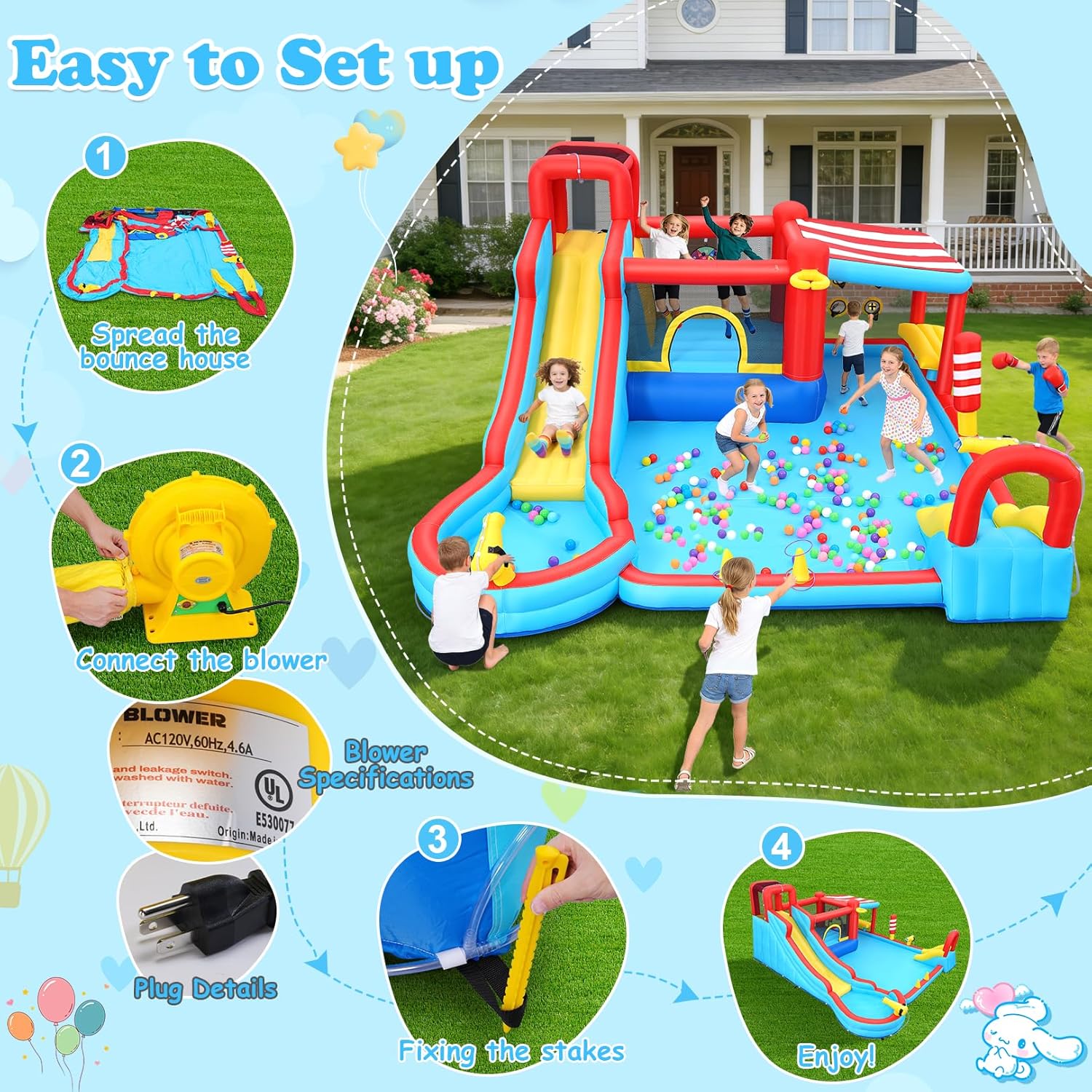 【Complete Package】 Everything you need comes in one box:1 bouncy castle,1 powerful 550W blower, 1 convenient carrying bag, 1 inflatable basketball, 1 air pump, 1 water hose, 11 ground stakes, 12 repair patches, 4 ring toss rings, 6 sticky balls, and 1 target board – ensuring endless entertainment right out of the box!