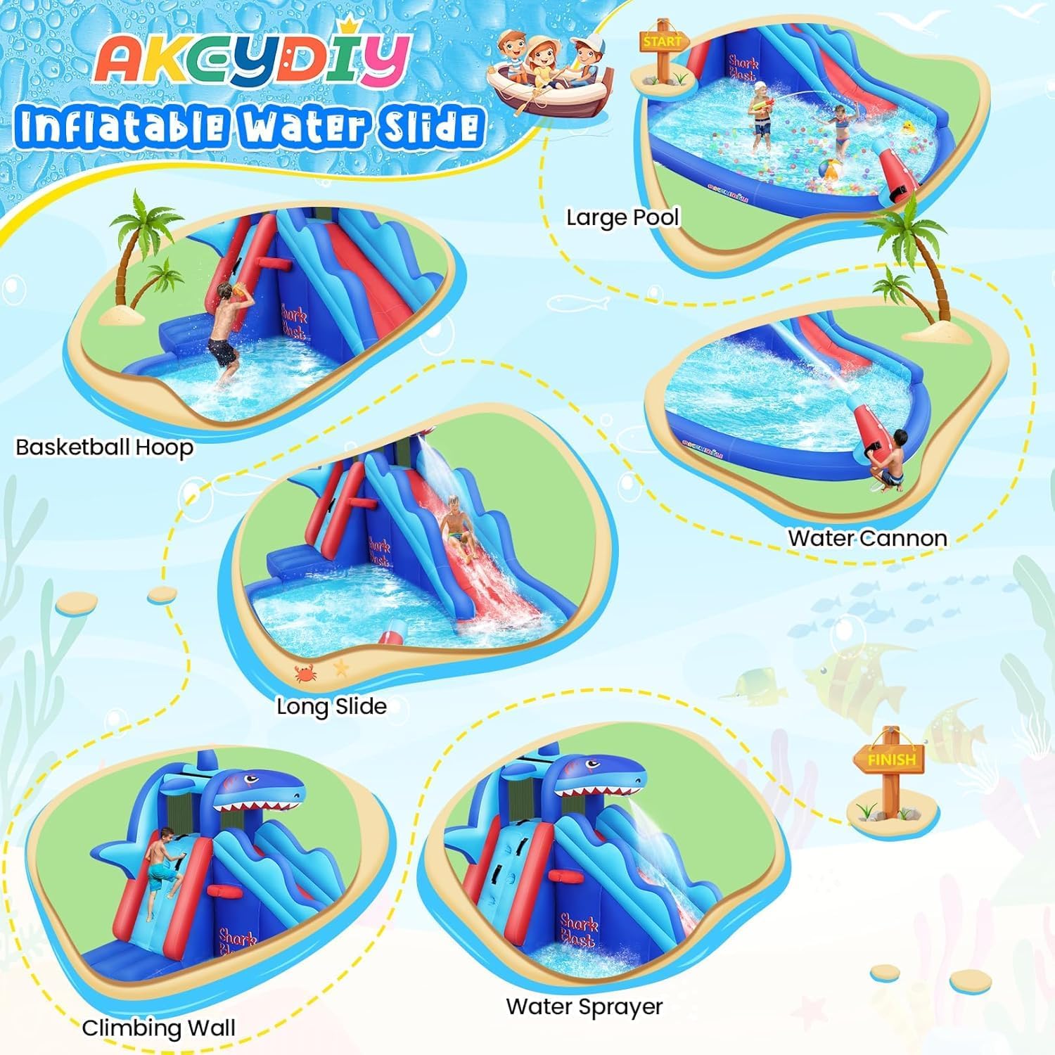🏖️ 【Ultimate Backyard Water Park for Kids】AKEYDIY inflatable water slide is designed as a full backyard water park with long slide, climbing wall, splash pool, water cannon, shower head, and basketball hoop. It’s the perfect inflatable water slide for kids 3-10 to enjoy splashing, sliding, and climbing in summer, replacing screen time with healthy outdoor fun.