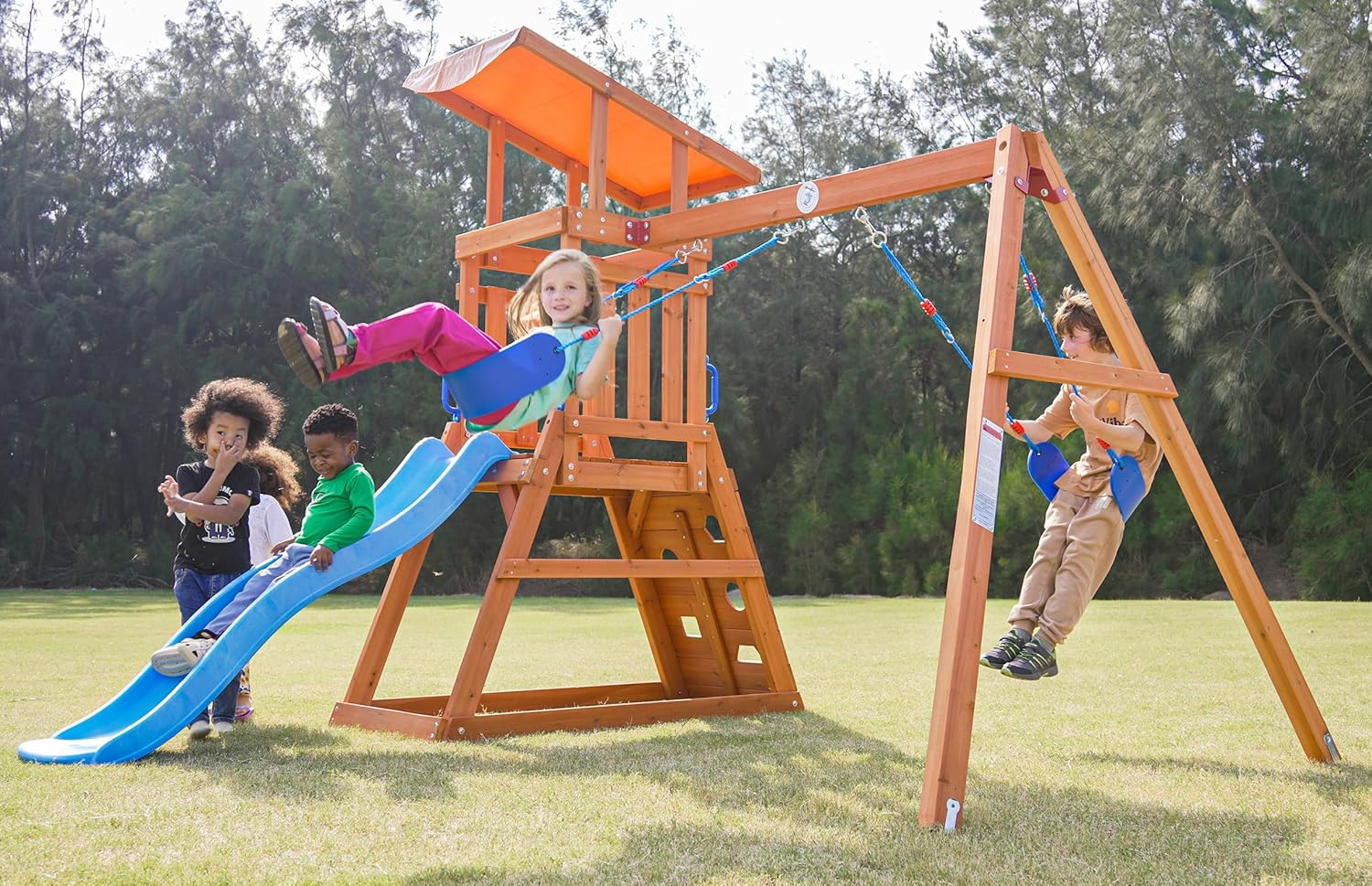 PREMIUM QUALITY CEDAR: Our swing set is made of high-quality cedar; It has good waterproof, anti-corrosion, and anti-crack functions; suitable for any weather