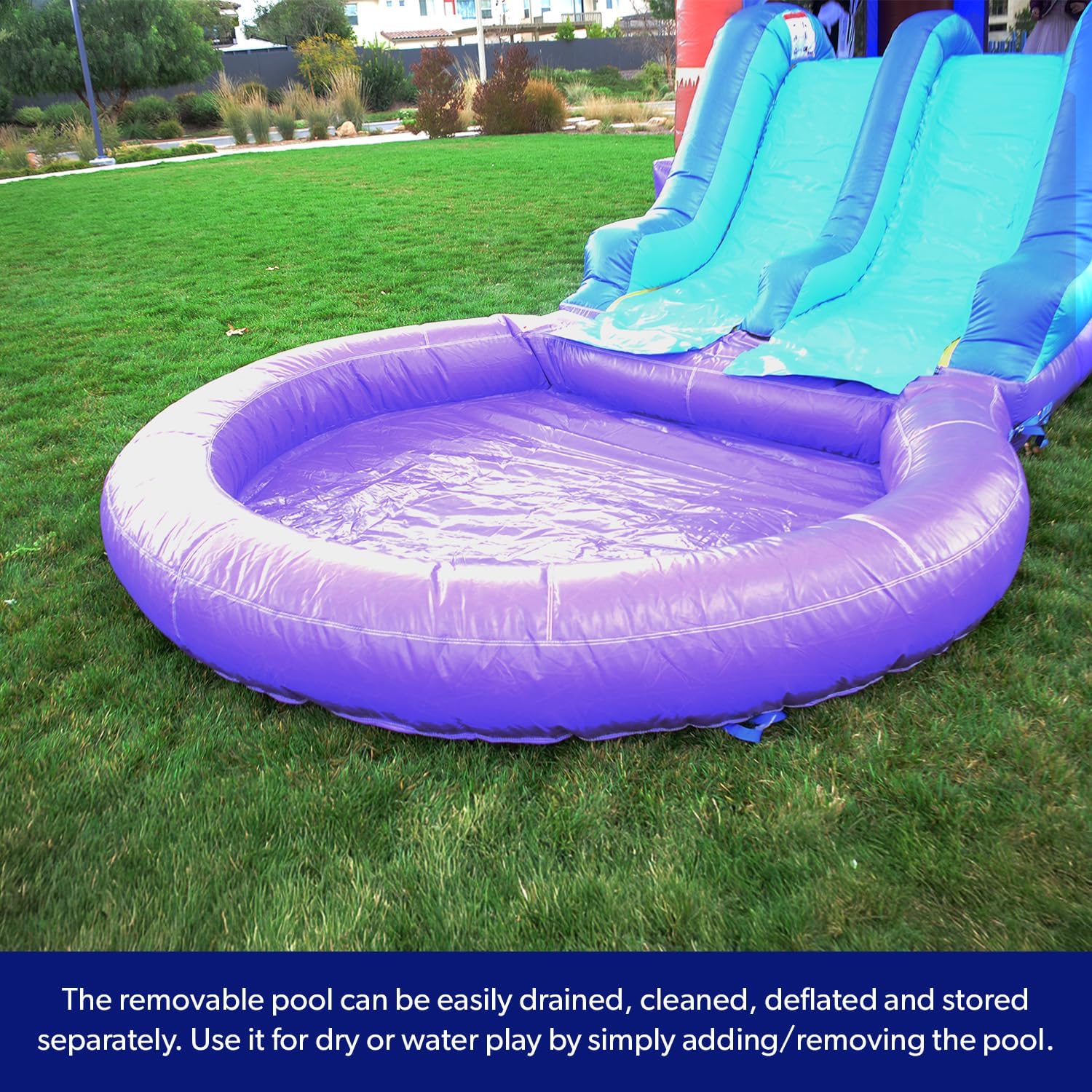 VARIETY OF PLAY: With our dual slides lane that can be used wet or dry, detachable splash pool that gives you the flexibility to use bounce house all seasons with or without a pool, bounce area, and basketball hoop. Kids can jump, slide, and enjoy themselves, while filling the pool with plastic play balls for endless entertainment.