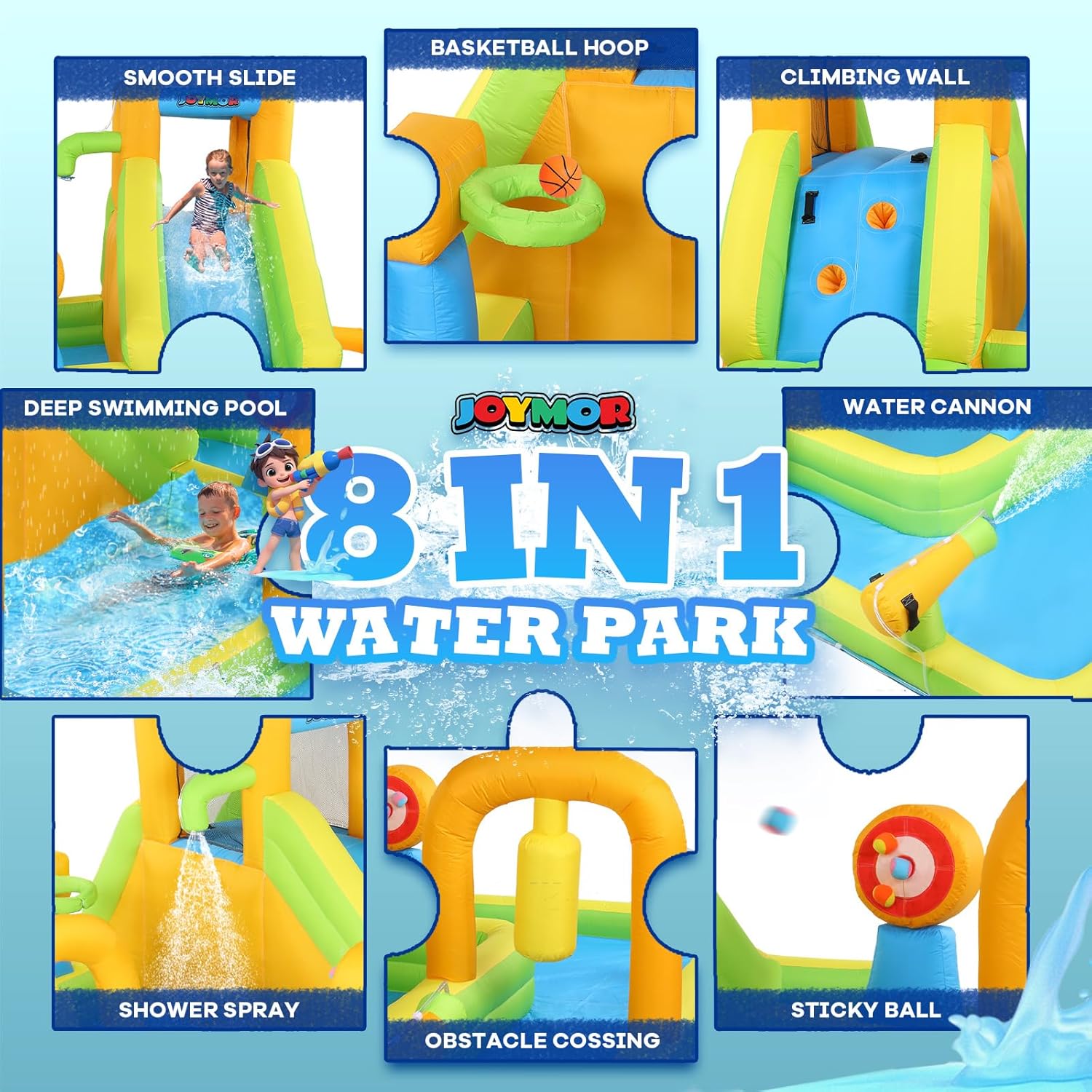 JOYMOR Inflatable water park with extra long lawn water slide and more. This will provide kids an exciting and happy summer party!