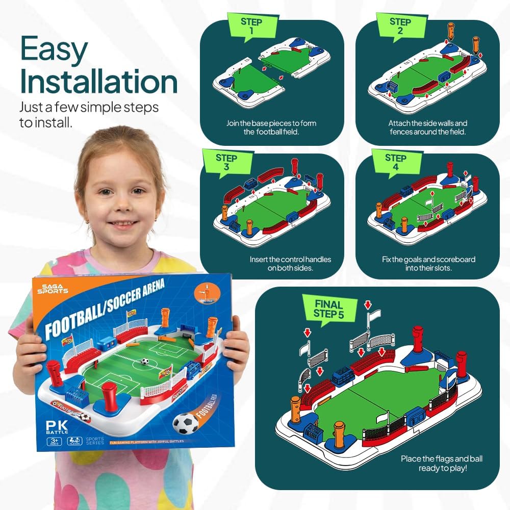 𝐄𝐀𝐒𝐘 𝐒𝐄𝐓𝐔𝐏 & 𝐒𝐀𝐅𝐄 𝐅𝐎𝐑 𝐊𝐈𝐃𝐒: Our mini soccer game is built from durable, kid-safe ABS plastic with smooth edges. No batteries needed — just assemble and play! Perfect for indoor soccer fun anytime.