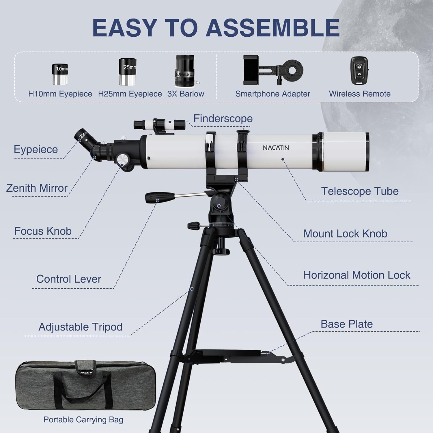 NACATIN Telescope, Telescope for Adults High Powered, 90mm Aperture 800mm Professional Refractor Telescope with AZ Mount & Sturdy Iron Tripod, Complete Kit for Astronomy Beginners with Backpack, White