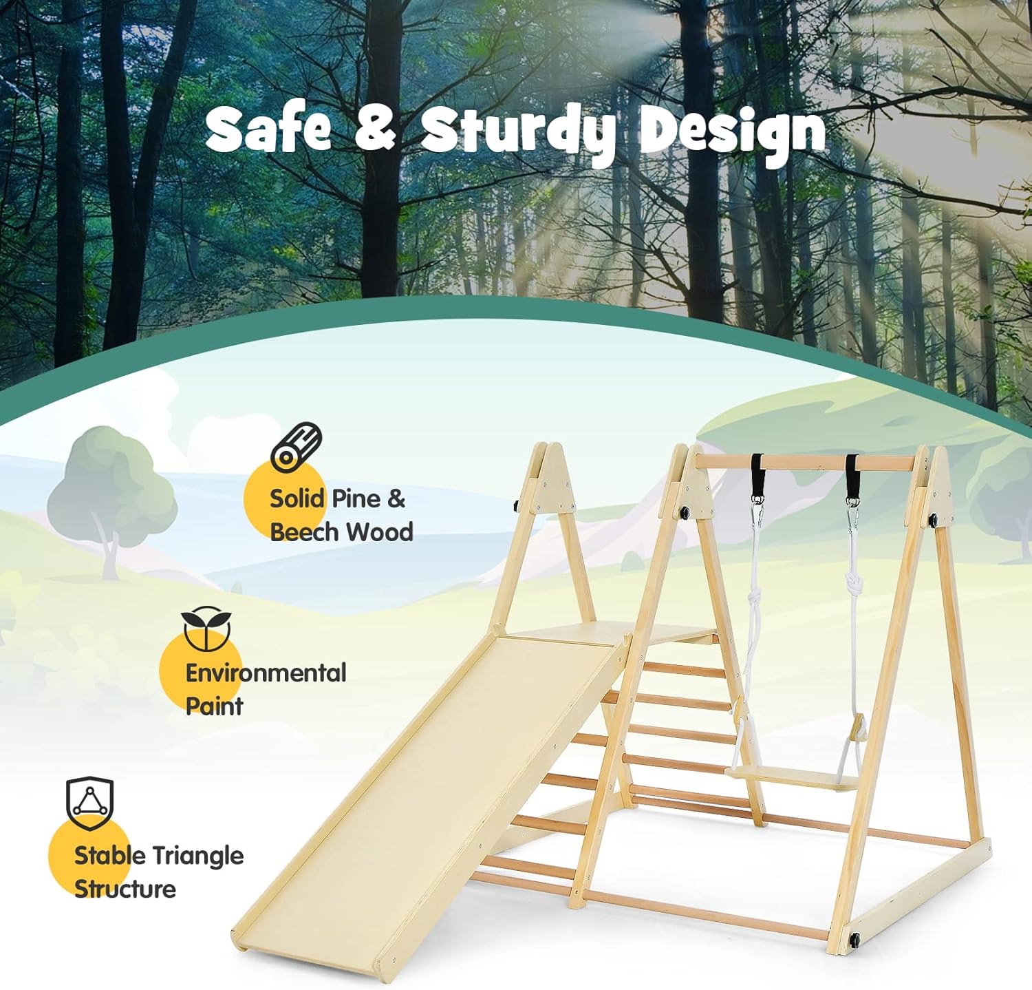 Stable Triangle Structure: The indoor playground for kids 3-6 is designed with triangle structure and made of solid pine and beech wood materials, which is strong and stable with the max weight capacity of 275lbs. The max load capacity of the swing is 66lbs.