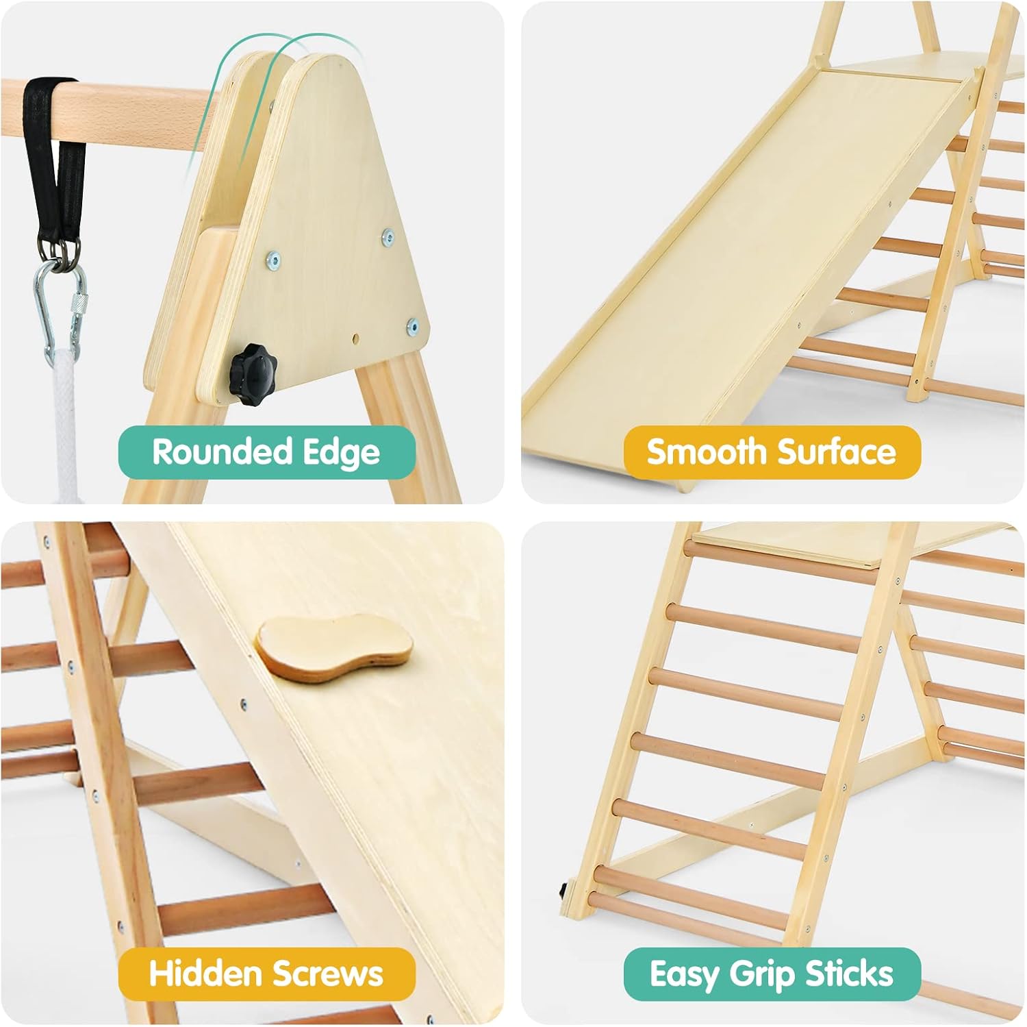 OLAKIDS Indoor Jungle Gym 4 in 1 Foldable Toddler Wooden Montessori Baby Climbing Toys with Swing Slide Ramp Ladder for Kids Playground Climb Activity Play Structure