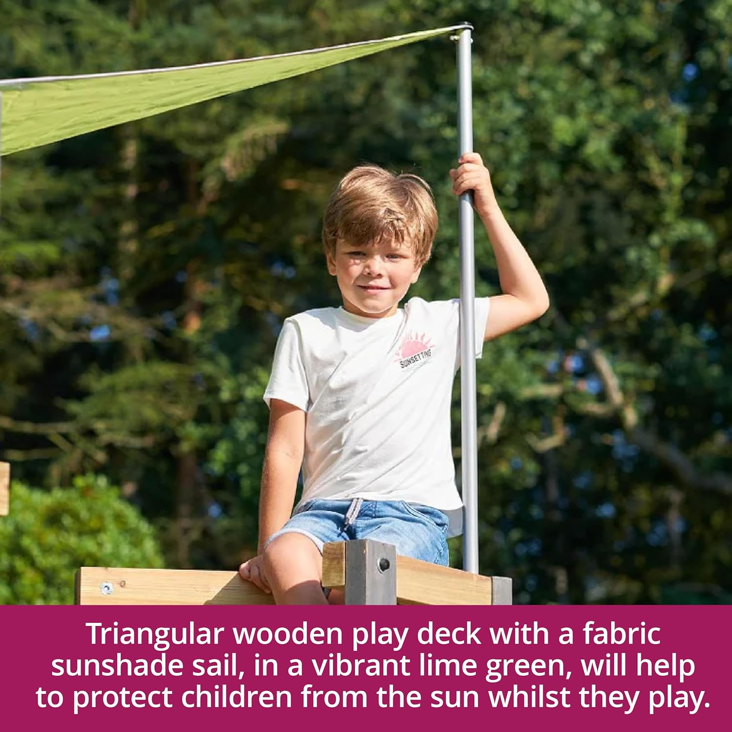 🛝 Elevated Adventure — The raised play deck comes complete with a vibrant lime-green fabric sunshade sail, offering kids a cool and shaded spot to play outdoors. Not only does it provide protection from the sun, but it also creates the perfect setting for imaginative exploration—whether it’s a lookout point, a secret hideout, or an adventure base. Encouraging hours of creative, sun-safe play.