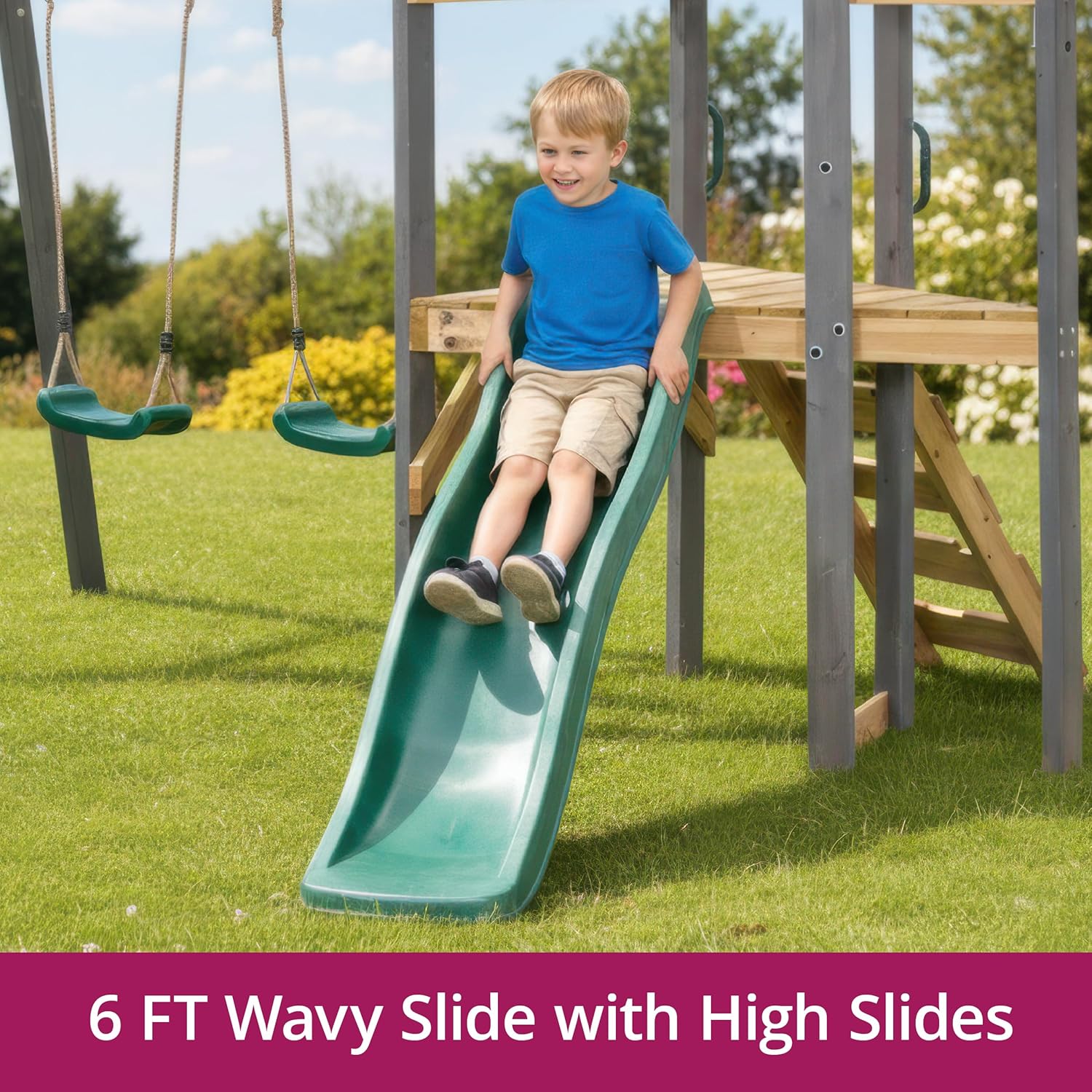 🛝 Designed for Little Explorers — Perfect for toddlers taking their first steps into active outdoor play! This toddler swing set features a sturdy wooden climbing ladder that leads to a fun triangular play deck, complete with a 6ft wave slide for exciting swoops and slides. Ideal for play adventure, building confidence, and keeping little ones active while having fun right in the safety of your own backyard!