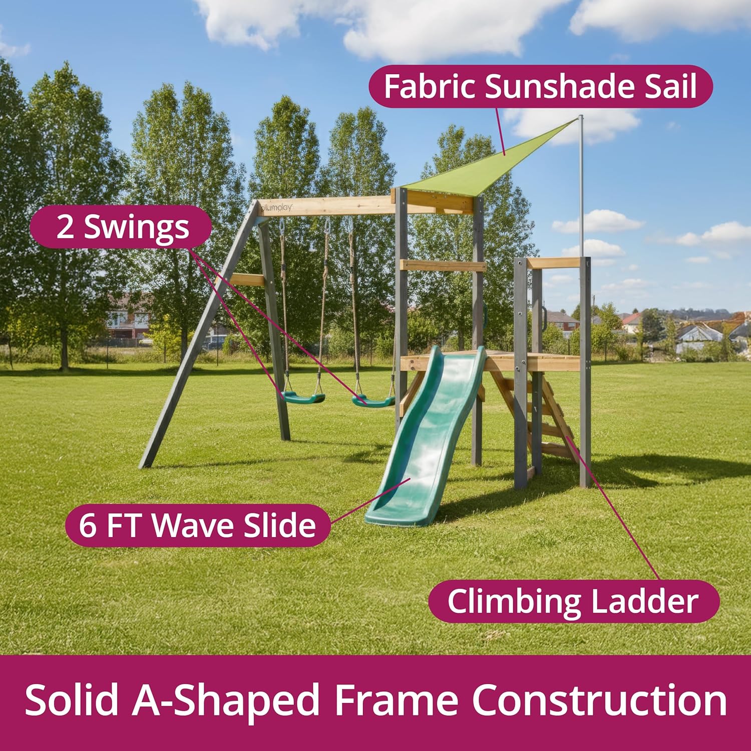 Turn your backyard into an adventure zone with the Plum Barbary Wooden Swing Set! This feature-packed climbing frame is designed for endless fun and active play. Kids can climb the sturdy wooden ladder up to the triangular play deck, then swoop down the 6ft wave slide for thrilling excitement. A vibrant lime green sunshade sail offers shade and comfort, while two single swings let friends or siblings play together side by side, building social skills while enjoying the freedom of outdoor play. Designed to grow with your children, this set offers the perfect balance of fun, adventure, and safe exploration. Crafted from sustainably sourced FSC®-certified timber, this wooden playset features a stylish stained finish in charcoal grey and light oak, giving it a modern, premium look that blends beautifully into any garden. Reinforced with powder-coated steel brackets, solid wooden beams, and ground anchors, it’s built for durability, safety, and years of outdoor fun. The Plum Barbary Wooden Swing Set is more than just a swingset—it’s a safe, exciting hub where children can explore, play, and create lasting memories outdoors.