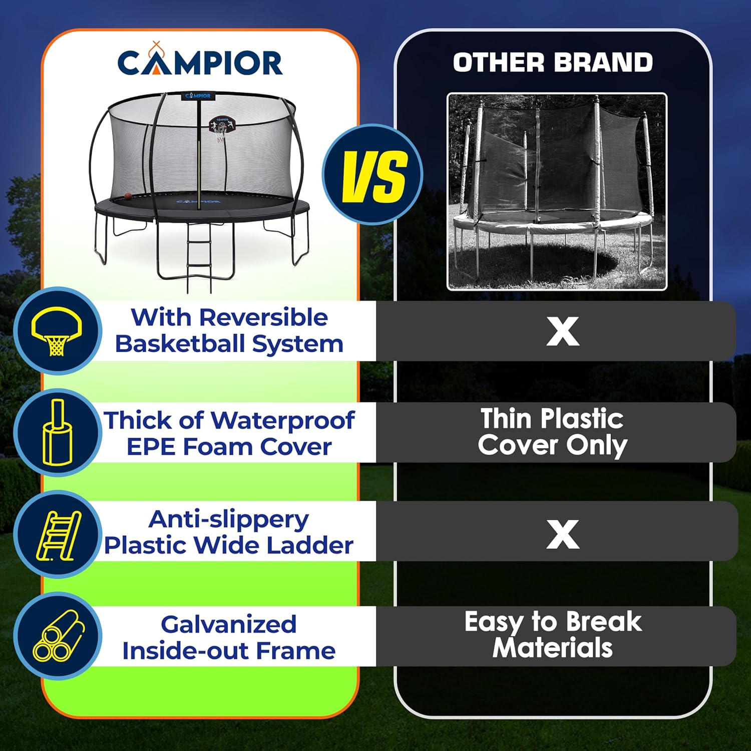Jump into endless fun and excitement with our Campior 12ft Pumpkin Recreational Trampoline! Engineered for safety, durability, and maximum enjoyment, this trampoline is the perfect addition to your backyard for kids and children. Let’s explore the features and benefits: Enhanced Safety: Our trampoline prioritizes safety with a protective safety net enclosure system featuring curved poles. This design not only prevents injuries and accidents but also provides a secure space for jumping, giving you peace of mind while your kids have fun. Durable Construction: Crafted with a heavy-duty galvanized steel frame and a 5000 hours UV-tested reinforced jumping mat, our trampoline is built to last. It can withstand the elements and resist wear and tear, ensuring long-term durability and enjoyment. Family Entertainment: Experience hours of entertainment and family bonding time with our trampoline. It’s designed for kids, children, teens, and young adults, encouraging outdoor exercise and active play while promoting a healthy lifestyle. Multi-functional: Take the excitement to the next level with the included luxury ladder and basketball hoop system. Transform your backyard into a versatile sports arena, offering endless entertainment options for the whole family. Easy Installation: Setting up our trampoline is a breeze. It comes with all the necessary hardware and easy-to-follow instructions for hassle-free assembly, allowing you to enjoy your new trampoline in no time.