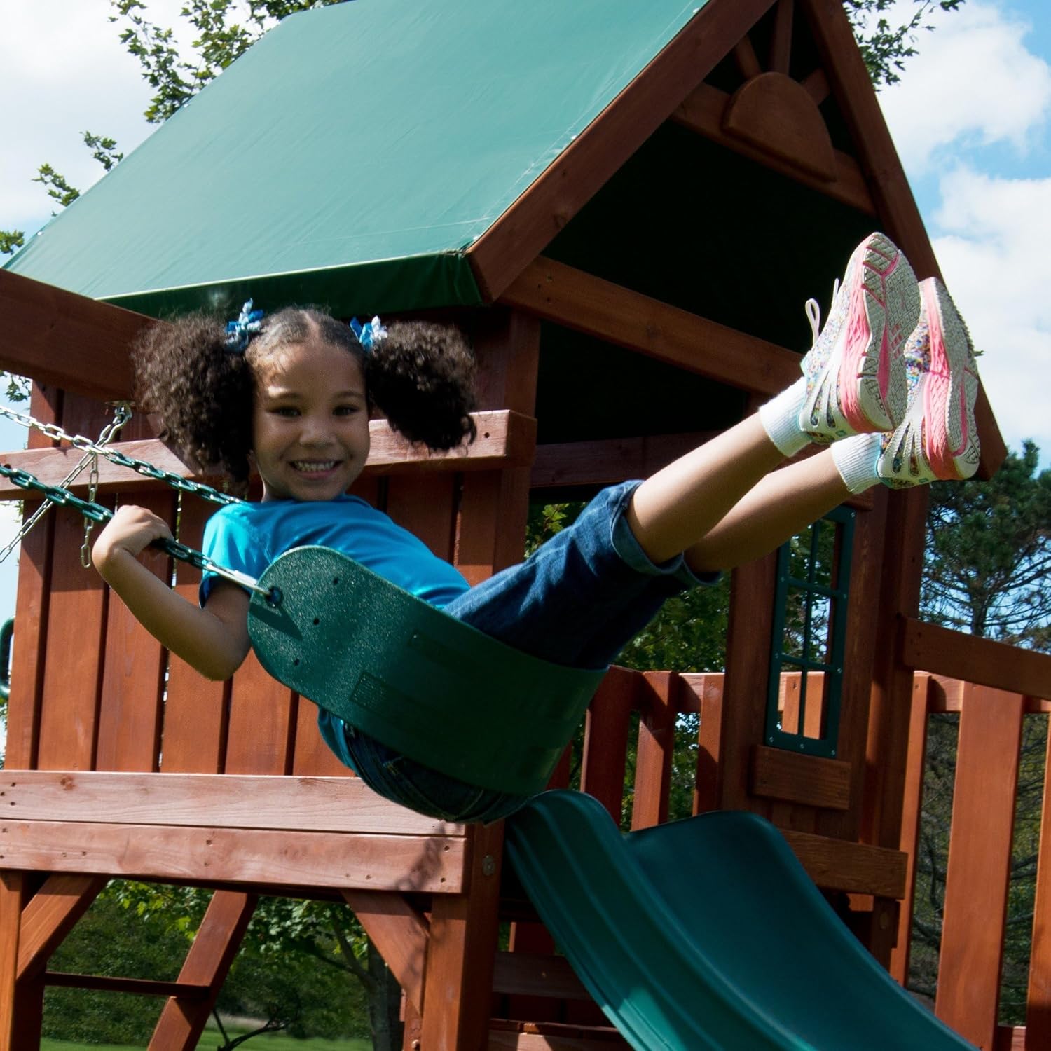 Swing-N-Slide Alpine View Wooden Swing Set with with Vinyl Canopy Roof, Plastic Slide, Climbing Wall, Picnic Table, and Swings, Green Slide