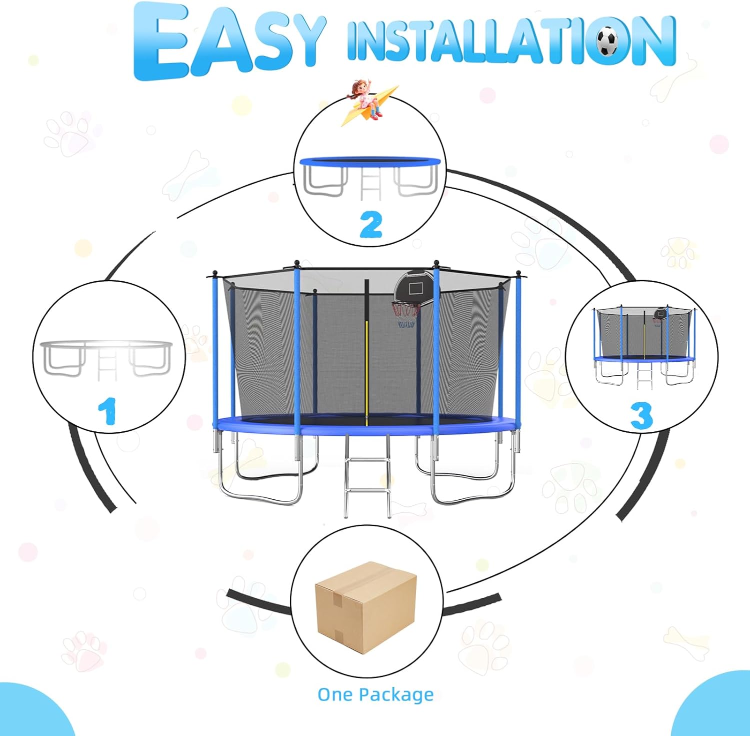 【Heavy Duty Frame and Accessories】12 feet trampoline offers 4 large U-shaped legs and 1.2mm thickened tubes for more stability and safety. The trampoline with basket adds fun to your kids’ jumping and allows you and your kids to have a carefree time!