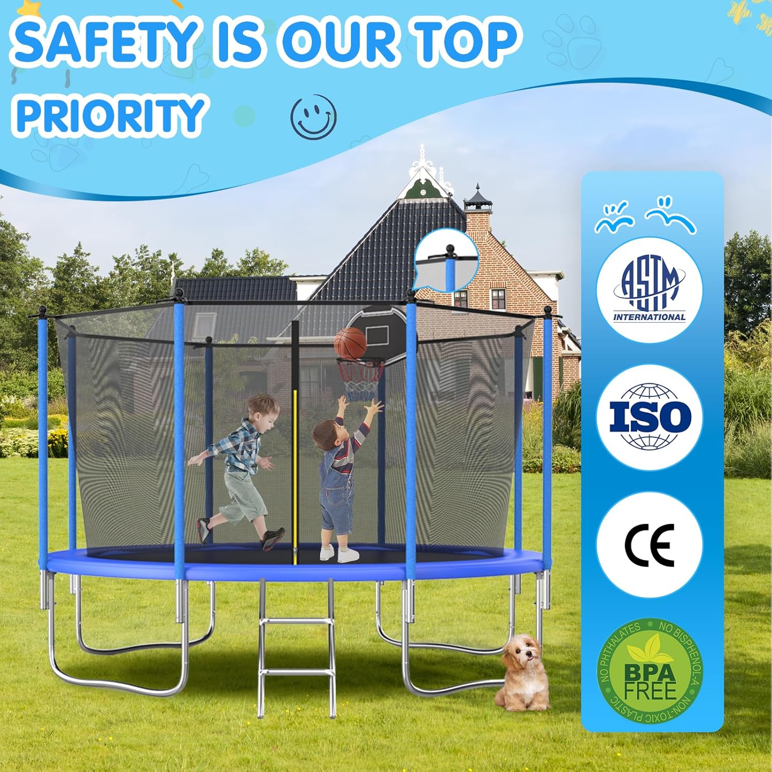 【Safety is paramount】– Our backyard trampoline is Premium Quality and pass ASTM, CE, TUV, and GS safety certifications.The heavy-duty PP jumping mat is stitched perfectly well,All springs and top rails are designed for fixing the whole trampoline. All trampoline materials have passed quality inspections and environmental protection inspections. Each trampoline is manufactured by our professional factory.