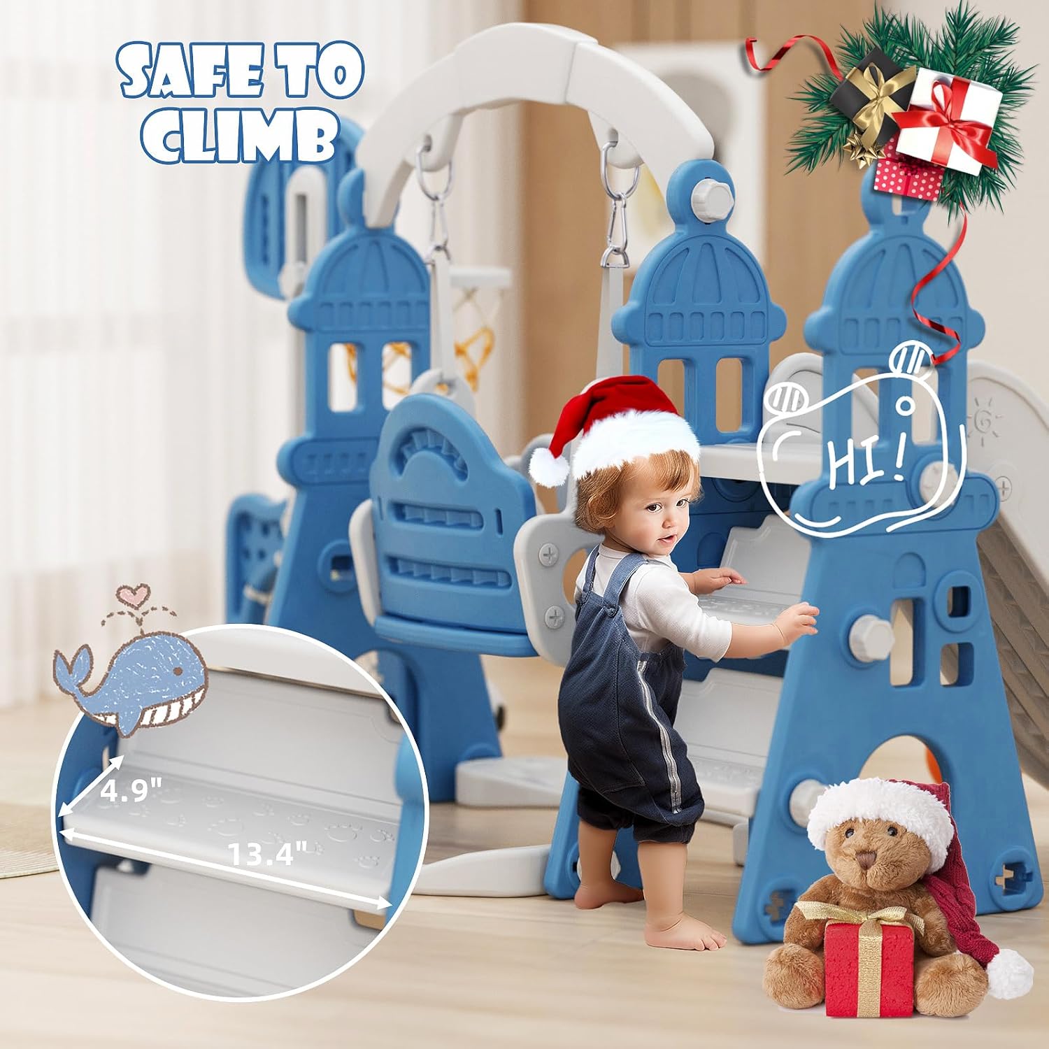 Toddler Playground :This toddler swing set has easy to climb steps and an ultra long 53.9-inch gentle slope slide, it can improve children’s physical coordination and develop their motor skills